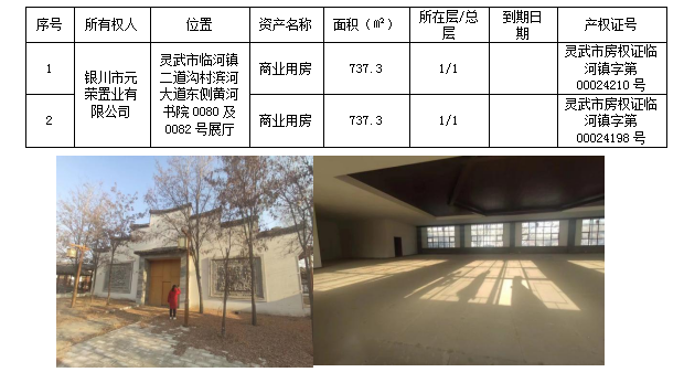 該戶債權(quán)抵押物位于靈武市臨河鎮(zhèn)濱河大道東側(cè)黃河書院內(nèi)0080號和0082號展廳,面積共計1474.6平方米。抵押物房屋戶型良好,寬敞明亮,有部分基礎(chǔ)裝修。該地理位置交通便利,距離銀川河?xùn)|國際機(jī)場約3公里。黃河書院集“文化傳播、學(xué)習(xí)靜修”為一體,環(huán)境優(yōu)美宜人,遠(yuǎn)離鬧市喧囂,適合經(jīng)營飯店、旅游展廳等。