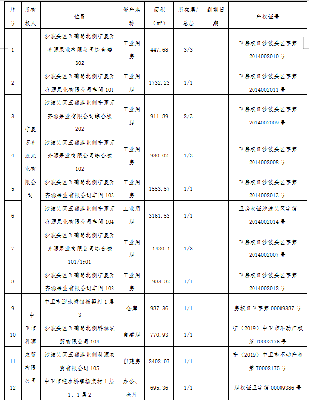債務(wù)企業(yè)為中衛(wèi)市明星企業(yè),企業(yè)產(chǎn)業(yè)鏈完整,暫時(shí)因資金鏈斷裂造成停產(chǎn),債權(quán)抵押物位于沙波頭區(qū)五葡路北側(cè),為新建辦公樓、廠房及冷庫,設(shè)施齊備。抵押物地處中衛(wèi)市區(qū)邊緣,交通便利,目前,部分廠房處于租賃狀態(tài),有較高的實(shí)用價(jià)值。
