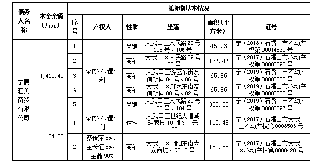 2022年12月28日,寧夏金融資產(chǎn)管理有限公司收購(gòu)石嘴山銀行持有的寧夏匯美商貿(mào)有限公司6筆不良債權(quán)。第一筆債權(quán)原貸金額為650萬元,截至2022年10月31日(基準(zhǔn)日),未償本金0萬元,未嘗利息90.82萬元,未償本息合計(jì)90.82萬元;第二筆債權(quán)原貸金額為650萬元,截至2022年10月31日(基準(zhǔn)日),未償本金0萬元,未嘗利息124.98萬元,未償本息合計(jì)124.98萬元;第三筆債權(quán)原貸金額為158萬元,截至2022年10月31日(基準(zhǔn)日),未償本金0萬元,未嘗利息5.16萬元,未償本息合計(jì)5.16萬元;第四筆債權(quán)原貸金額為620萬元,截至2022年10月31日(基準(zhǔn)日),未償本金0萬元,未嘗利息21.20萬元,未償本息合計(jì)21.20萬元;第五筆債權(quán)原貸金額為1428萬元,截至2022年10月31日(基準(zhǔn)日),未償本金1,419.40萬元,未嘗利息224.69萬元,未償本息合計(jì)1,644.09萬元;第六筆債權(quán)原貸金額為147萬元,截至2022年10月31日(基準(zhǔn)日),未償本金134.23萬元,未嘗利息26.17萬元,未償本息合計(jì)160.40萬元(基準(zhǔn)日之后的利息也在本次處置范圍之內(nèi))。